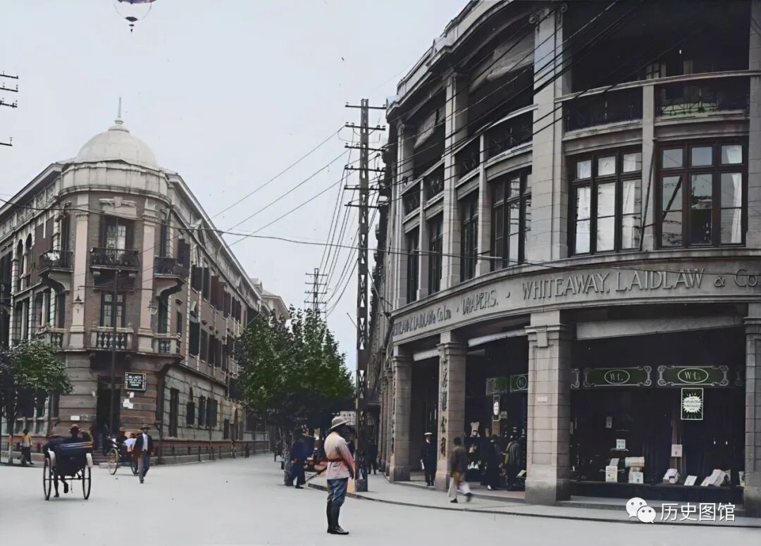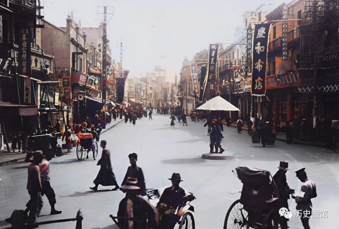 这是当时法国在汉口的租界街景。街边建筑为典型的法式风格,沿街店铺也是法国人开设的。一名警察正站在路口维持秩序。