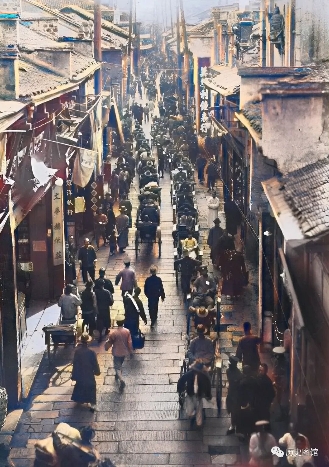 这是30年代武昌一条繁华街巷。街道由青石板铺成,街道两侧店铺林立,招牌旗帜目不暇接。街上行人摩肩擦踵,可见当时的武昌多么的繁华热闹。