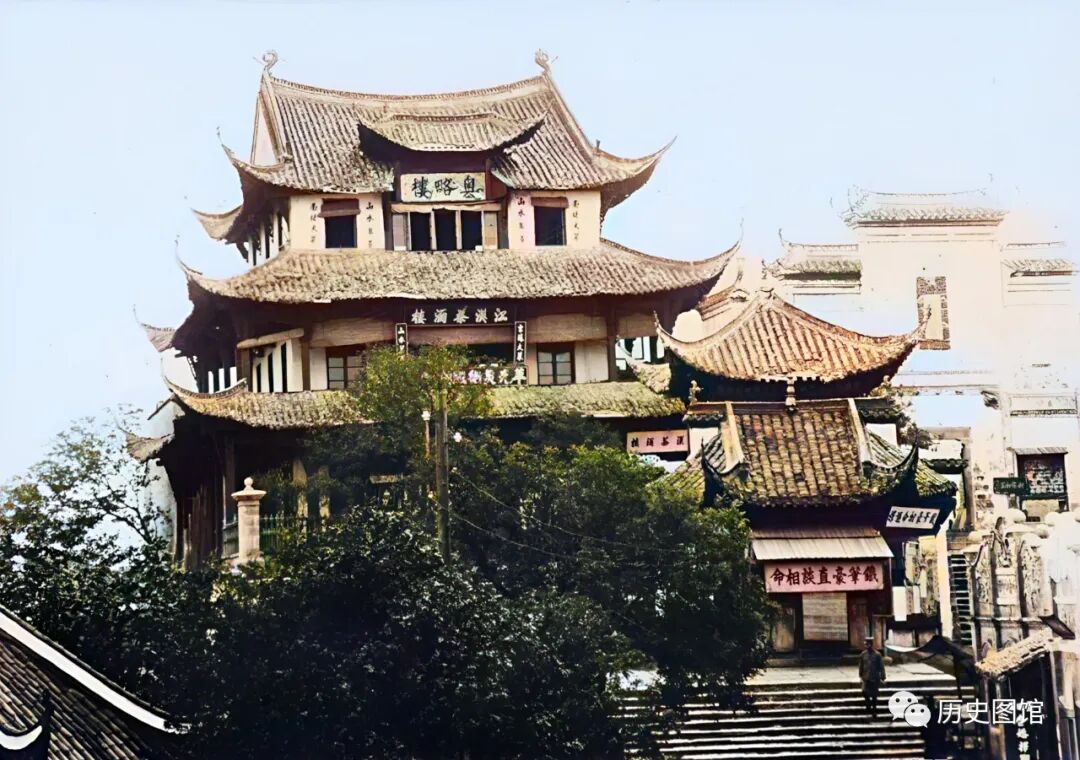 这是30年代的奥略楼,该楼始建于清光绪年间,是为了纪念湖广总督张之洞而建,以表功绩。奥略楼飞檐高挑,粉墙黛瓦,颇有韵味。悬挂在最上面一层的匾额上,“奥略楼”三个字十分醒目。