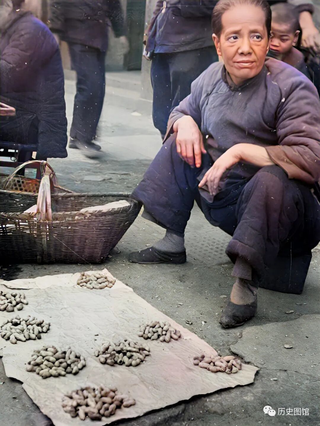 30年代的武汉街头,一名老人正在街边摆地摊卖花生。因为没有秤,她把花生分成小堆卖。日军统治下的武汉底层百姓,生活困苦,做点小本生意养家糊口。