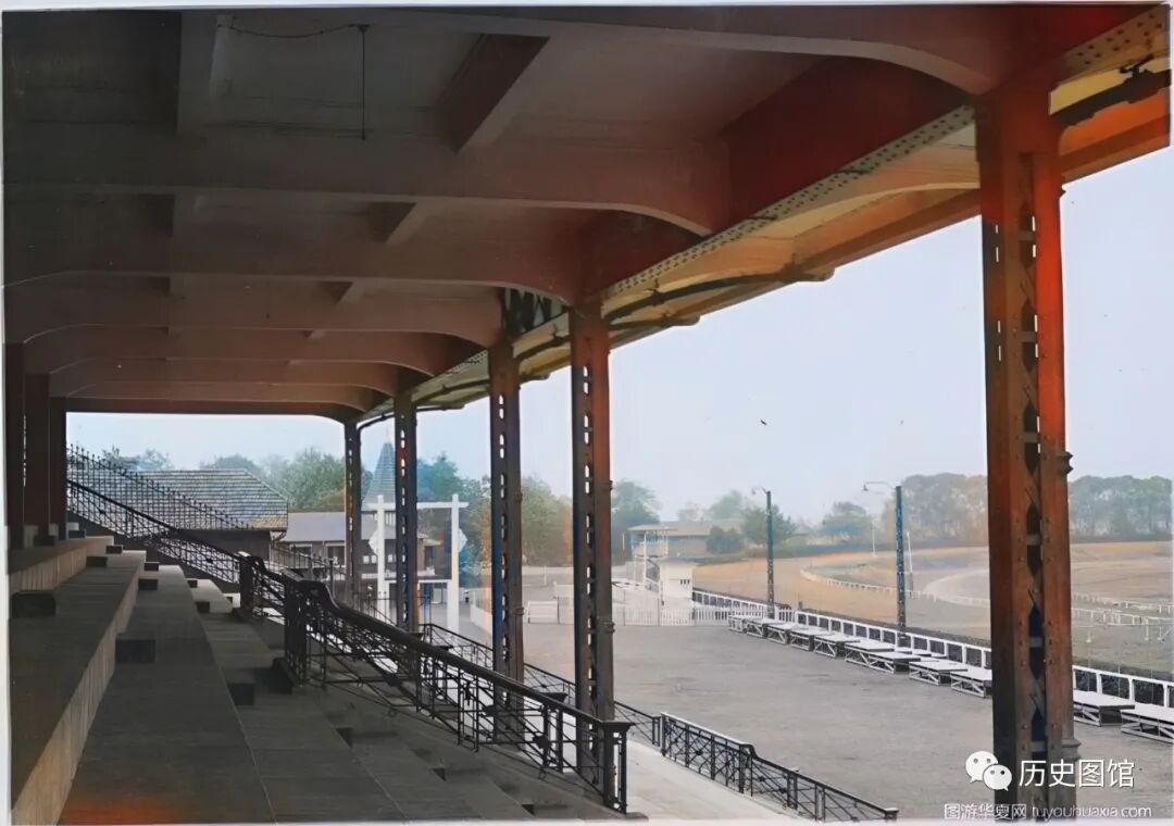 这是一座规模宏大的赛马场,中间的跑马赛道宽阔,赛场边的看台上建有遮阳棚。