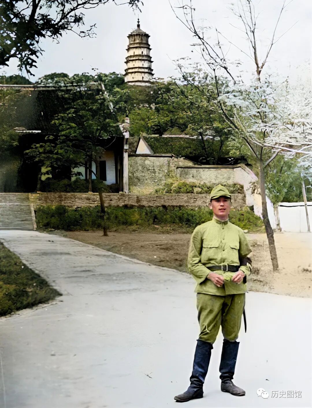 30年代,一名日本兵站在宝通禅寺前。远处矗立着洪山宝塔,塔高7层,巍峨壮观。宝通寺具有丰富的佛教文化底蕴和深厚的传统文化内涵。