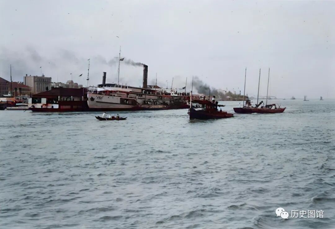 照片中,一艘悬挂英国国旗的轮船停靠在码头上,正准备起航,高大的烟囱冒出了黑烟。