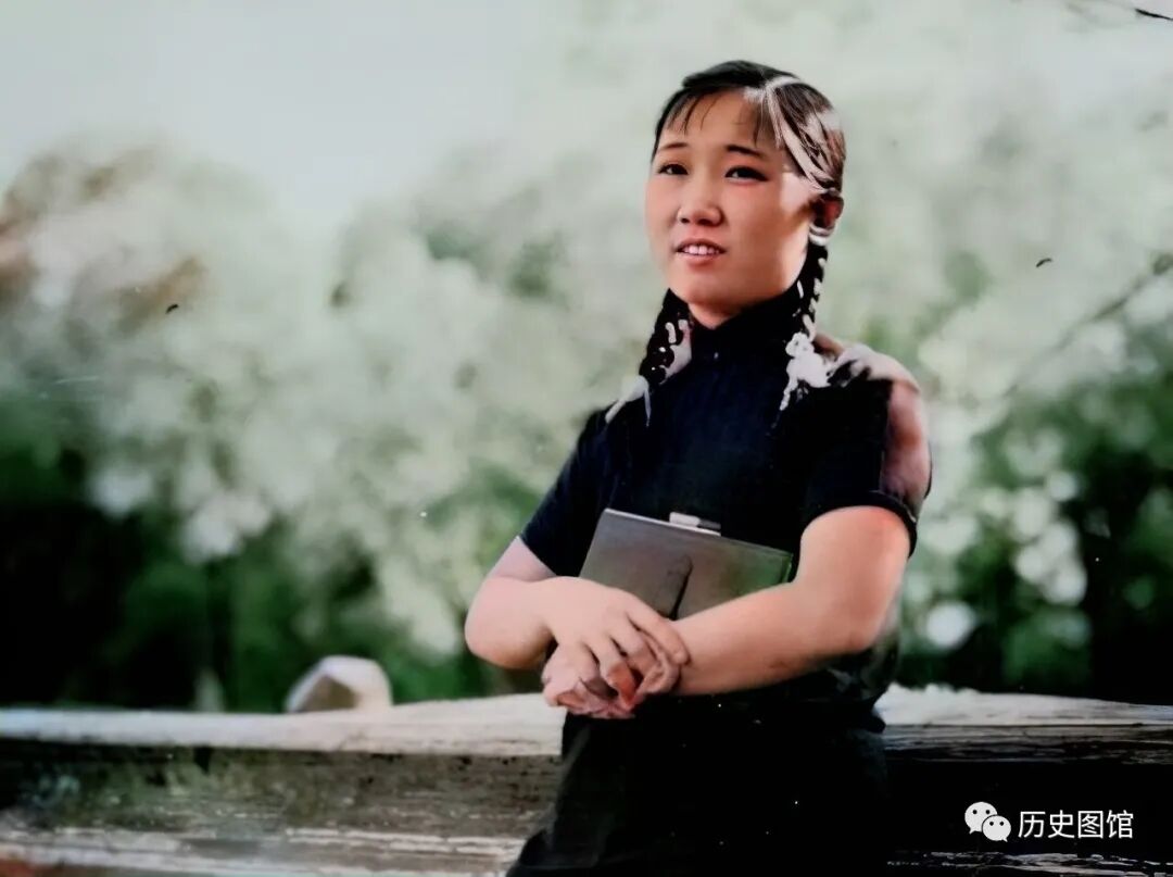 这是30年代一名女学生,课余时间站在校园中,气质清新脱俗。她梳着麻花辫,怀抱笔记本,眼睛里流露出对美好生活的向往。