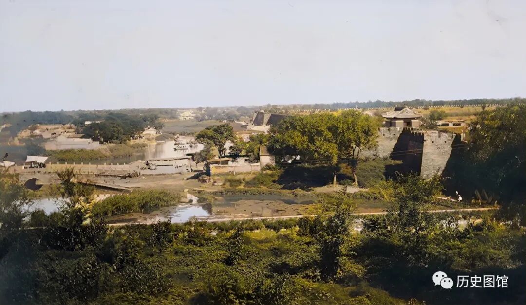 这是1912年的北京便门附近,城外绿树成荫,护城河上建有一座石桥。东便门,是北京外城东南端的一座小城门,位于北京城墙东南端角楼旁边,主要由城楼和箭楼组成。东便门于1958年拆除。