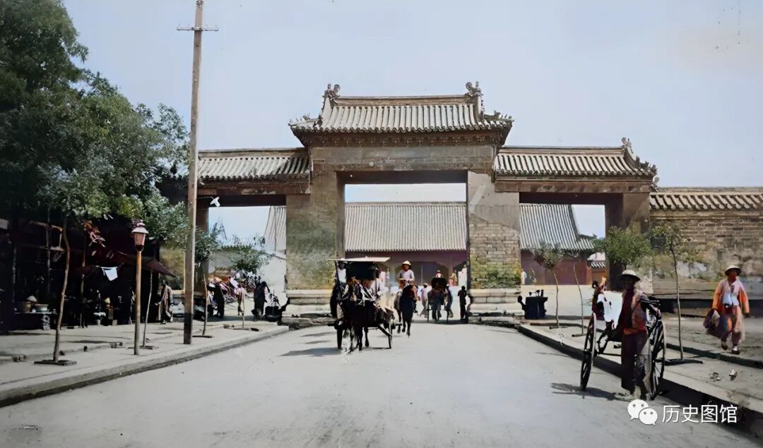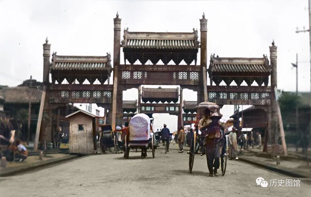 这是1912年的北京东安门。北京皇城有四个门,东安门是皇城的东门,始建于明永乐十八年(1420年)。建筑样式为七间三门黄琉璃单檐歇山顶。门里还有一座石桥。