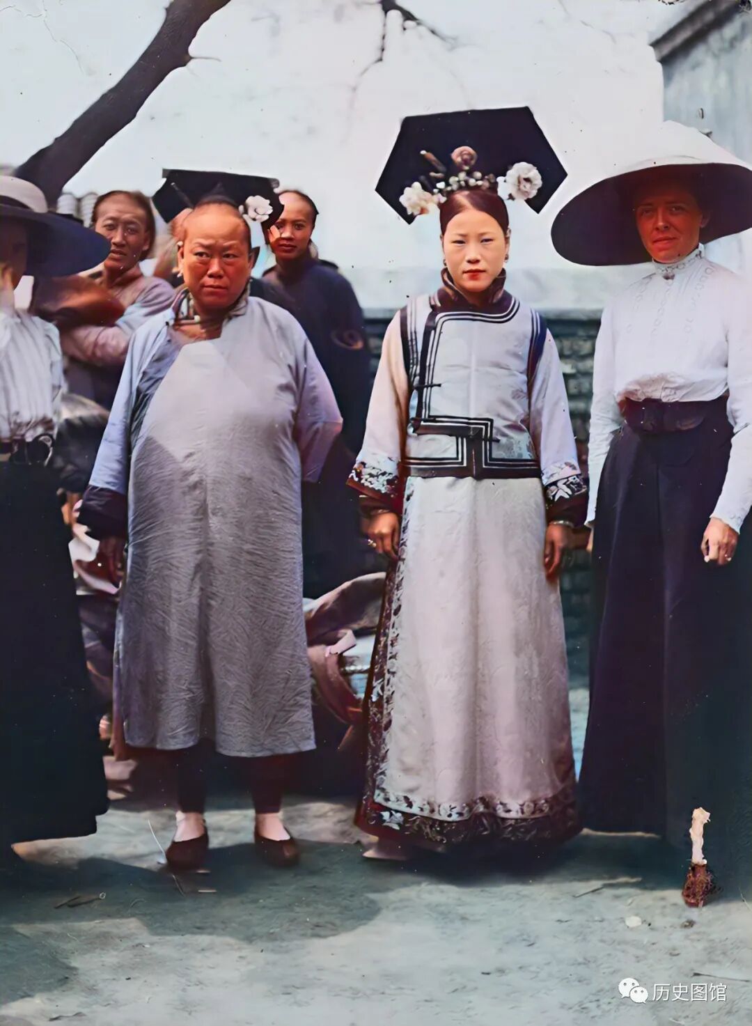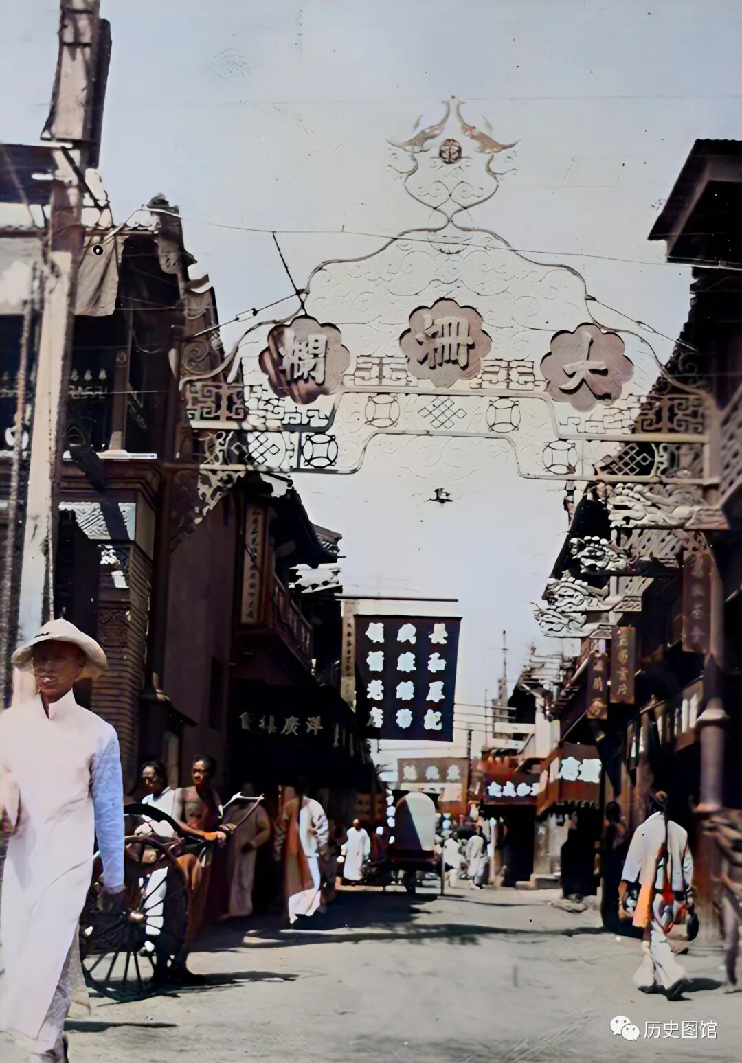 这是北京街边的一家商店,几名满族妇女头戴旗髻,身穿旗袍,手中拿着团扇,个个风姿绰约地从店铺门前走过,引得身后几名汉族百姓回头张望。