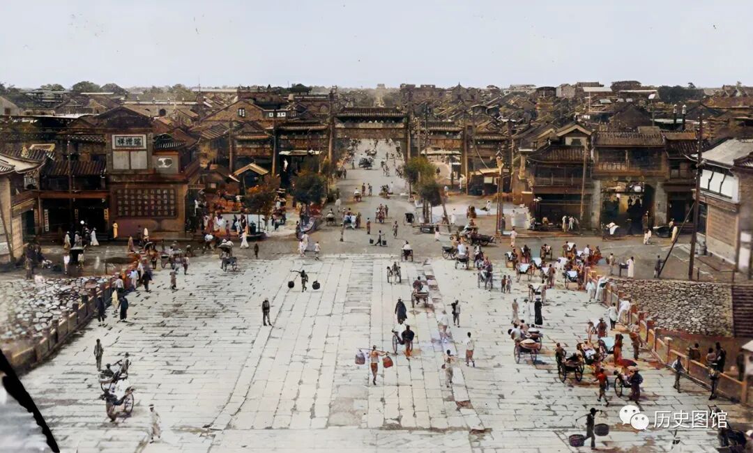 宽阔的石桥上铺着石板,行人熙熙攘攘,有的推着小车,有的挑着担子,黄包车拉着客人来往不断。