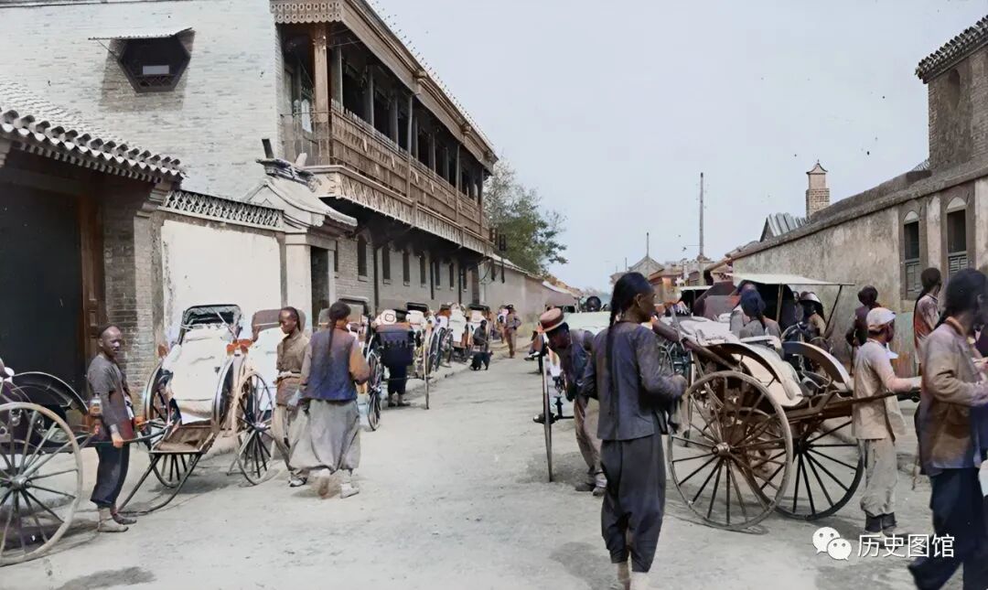 这是1912年的北京金鱼胡同,胡同道路两侧,停满了黄包车。当时的金鱼胡同两侧,不是店铺就是高墙大院。