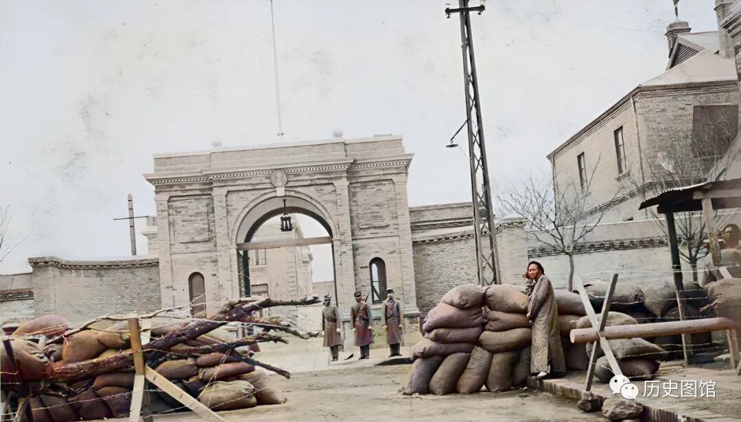 照片中这座欧式风格的大门,是当时的美国公使馆。门口站着3名全副武装的卫兵,门外堆放着很多沙袋和木头,组成了一处路障。