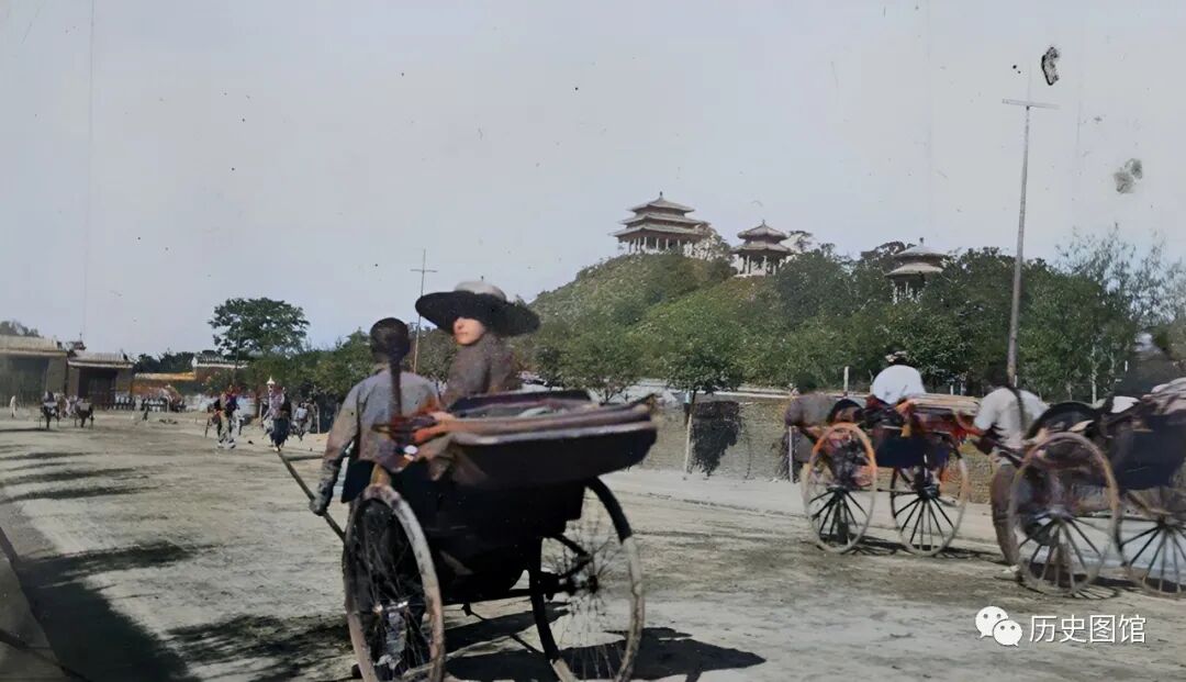 景山,是一座古老的皇家园林,也是北京著名的游览胜地,有很多黄包车拉着游客来往于景山。