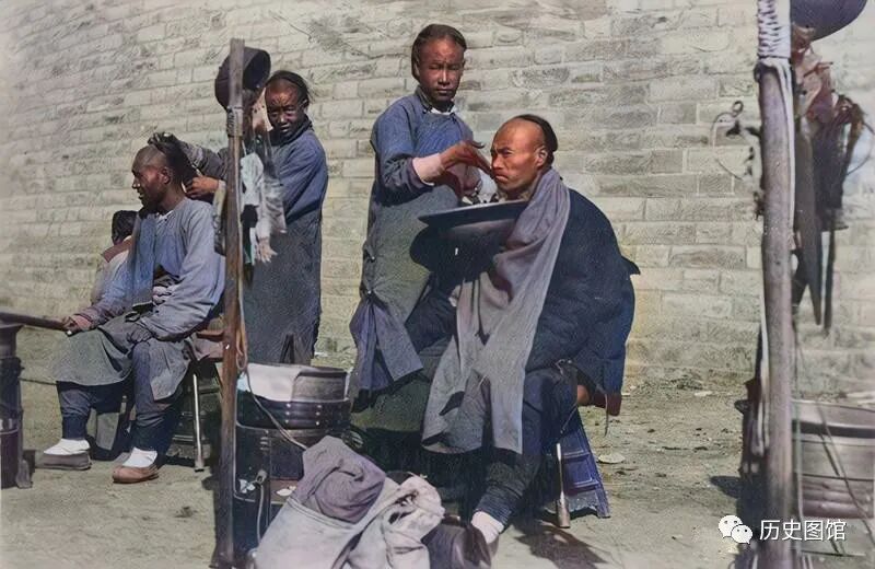 在街道边上,两位理发师正在为顾客理发、刮面。他们会挑着担子走街串巷,随时随地停下来,方便百姓理发。有了理发这门手艺,也能养家糊口。