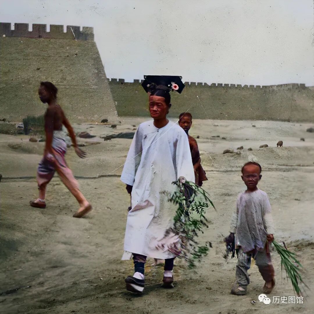 一名满族妇女带着孩子,手里拿着树枝从城墙外走过。仔细看,这位年龄稍长的满族妇女,长相很像一个人。