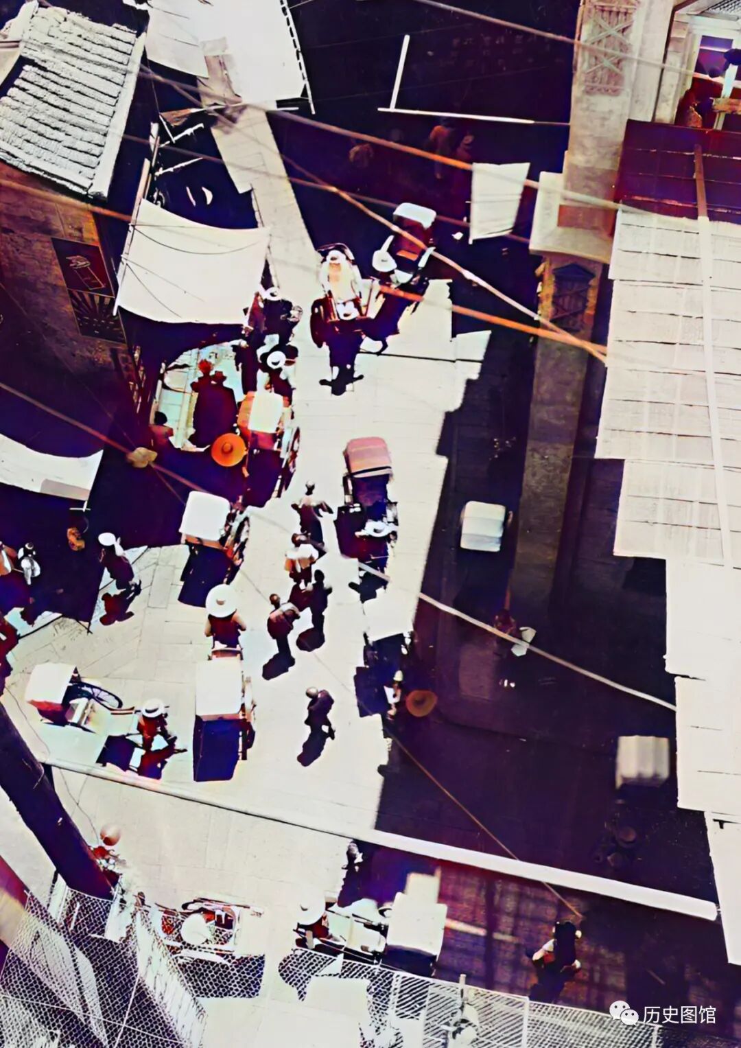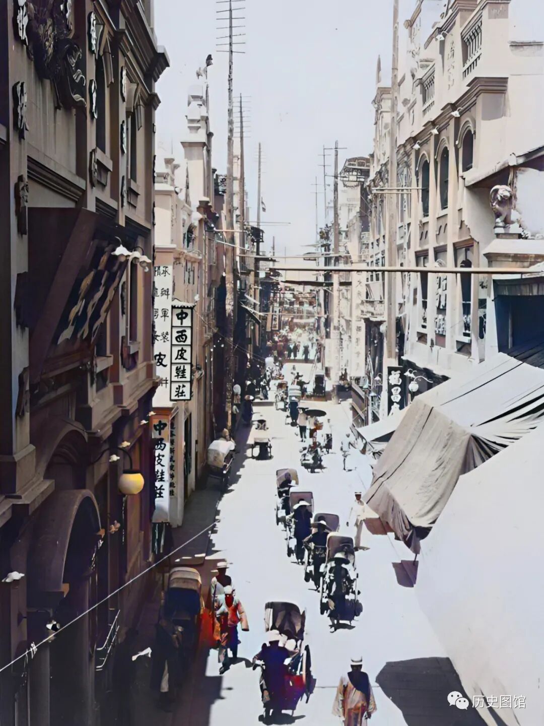 30年代,长沙一条老街的实拍场景。正值中午,阳光明媚,街道上行人如织,几辆黄包车穿梭其中。沿街店铺的门口,搭着遮阳的棚子。单从这一个角度,就能感受到老长沙生活气息的浓郁。