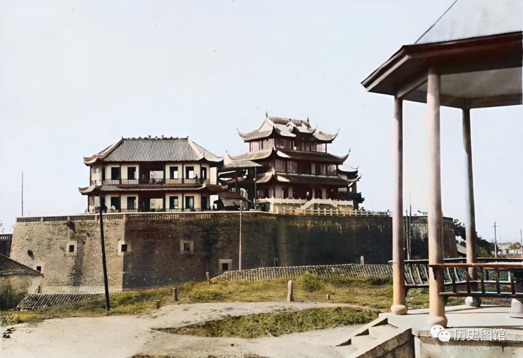 30年代的长沙天心阁,修建于城墙之上,楼阁共三层,雕梁画栋,飞檐高挑,蔚为壮观。