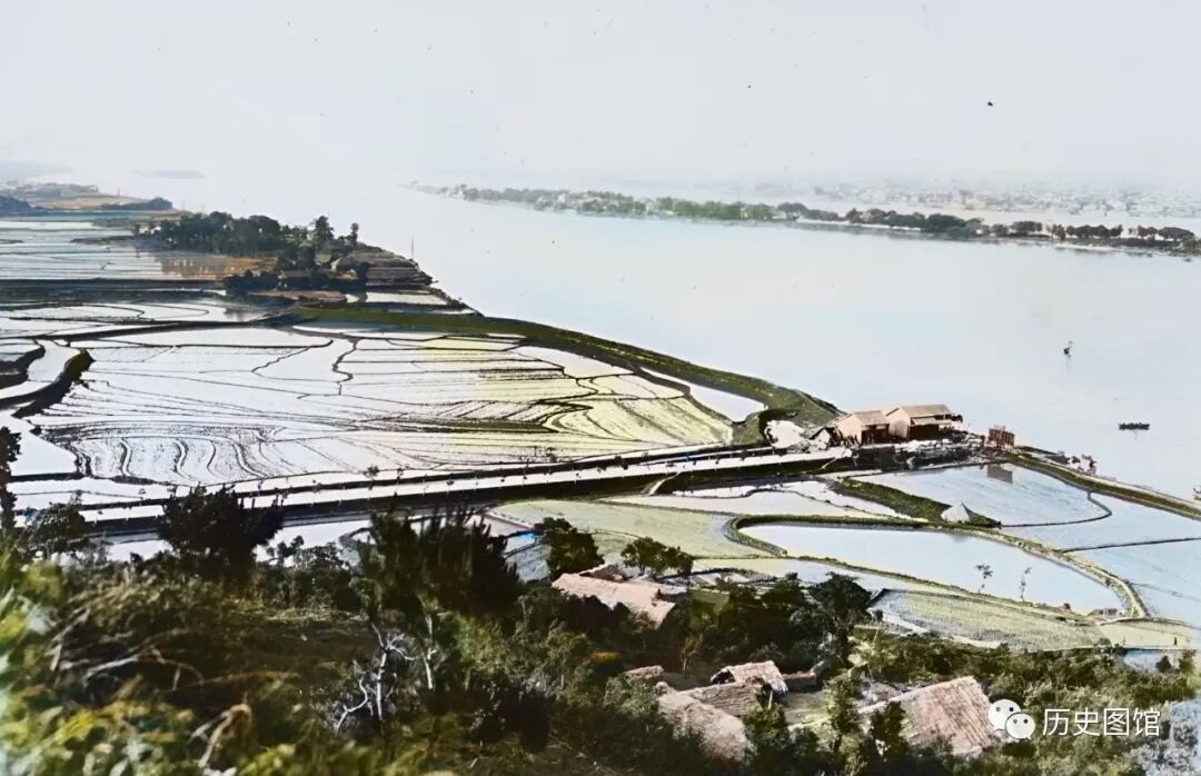 30年代湘江两岸美景,江面烟波浩渺,水天一色,一眼望不到边。岸边,是一块块绿油油的稻田。