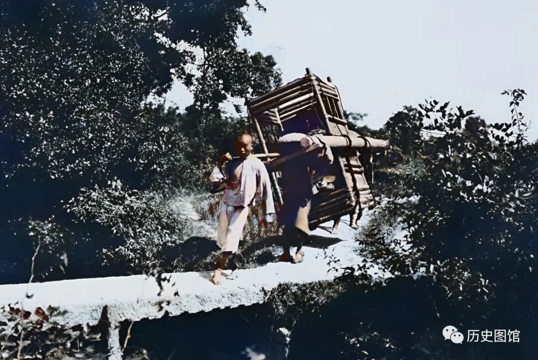 几名轿夫抬着一顶轿子,从大路上走来。他们要通过这座只能单人走过的小石桥。这的确是要考验几个人的配合。只见几名轿夫走路如风,轻车熟路,着实真让人捏一把汗。