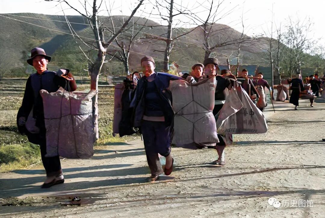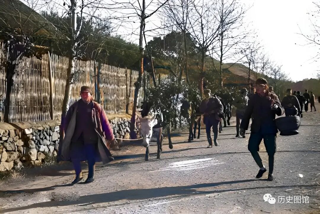 大路上,走来几名牵着驴的军人,驴背上驮着货物。这可能是驻守长沙的军人去集市上采购物品归来。