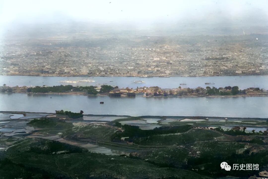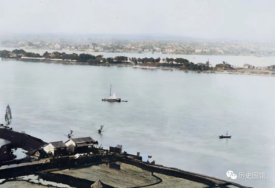 湘江,可以说是湖南的母亲河。江心那座依稀可见长岛就是橘子洲,它是长沙的重要名胜之一,当时岛上的面貌和现在完全不一样。