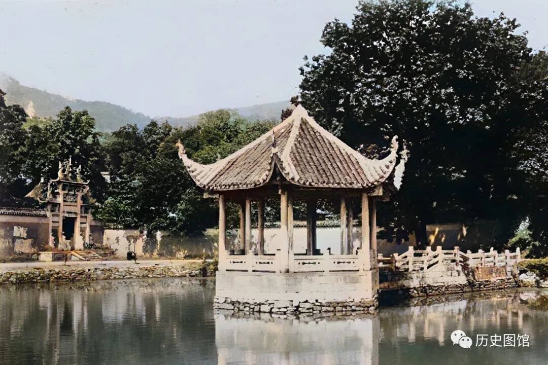 岳麓书院里有座黉(hong)门池,池边有座吹香亭。此处就是著名的岳麓八景之一的"风荷晚香"。但是,在抗战时期,吹香亭被毁,只剩下亭边的石桥。
