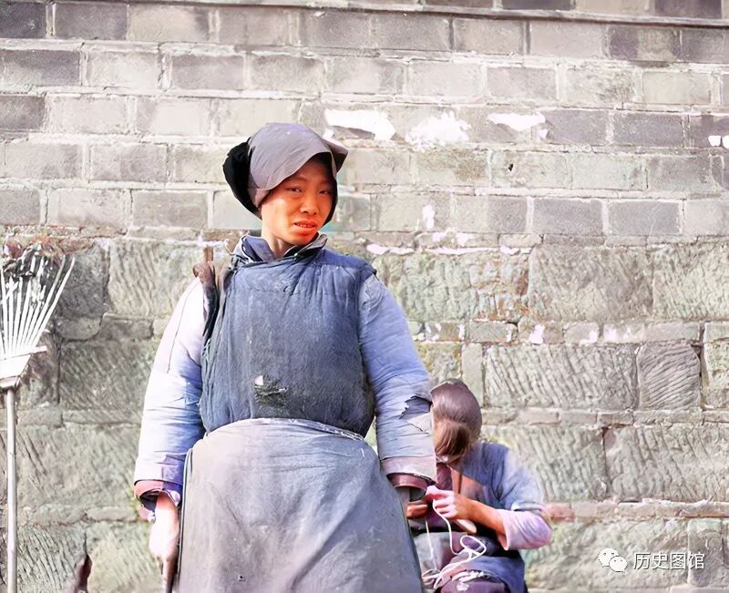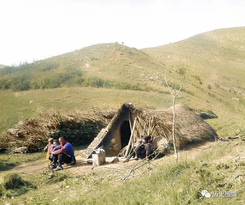 这是住在南京城外山坡上的一户人家,他们用干草在平地上搭建了一间低矮的草房,也叫窝棚。墙壁用泥巴和土坯修建,灶台就建在门口。