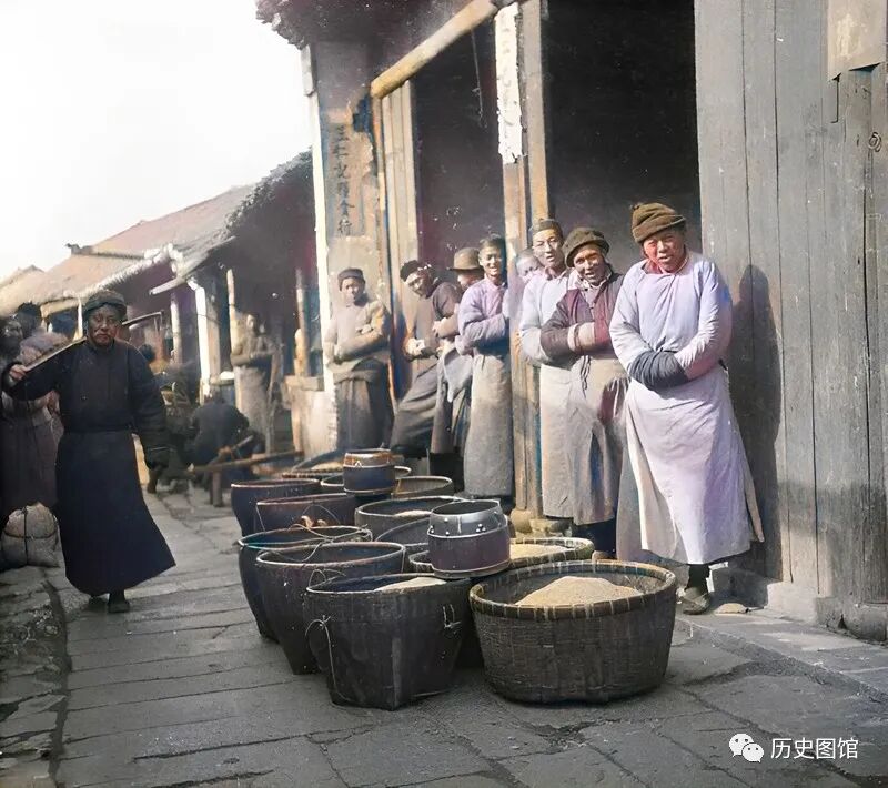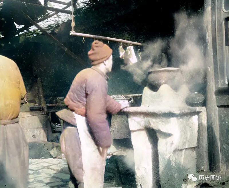 这是街边一家小吃店,店主正守着炉子,炉火上的锅里冒着热气,煮的好像是肉汤。这样的街边摊,种类繁多,经济实惠,在当时也很常见。这也让南京这座古城充满了人间烟火味。