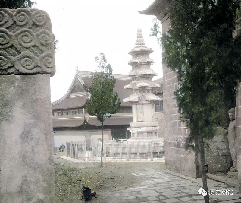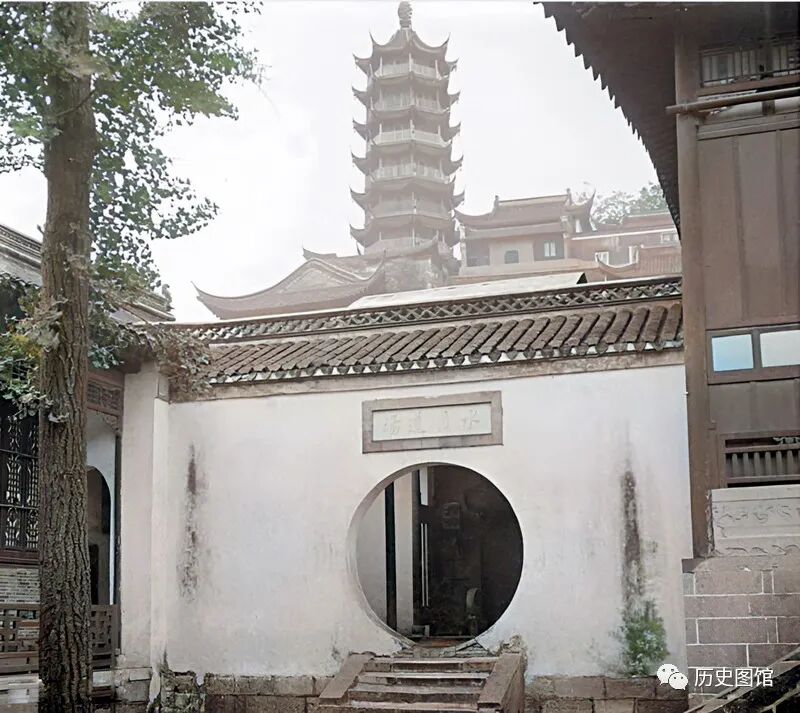 这张照片拍摄于一座寺庙,从远处古塔的造型看,应该是弘觉寺塔。弘觉寺位于南京牛首山南麓。始建于唐大历九年(774年)。古塔后来损毁,照片中的塔为明代所建。