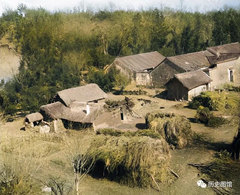 30年代,南京城外一个小村落。有砖瓦房,也有草房。在院子的空地上,有很多干柴草垛,充满了浓郁的乡土气息。在过去,这样的村落很常见。