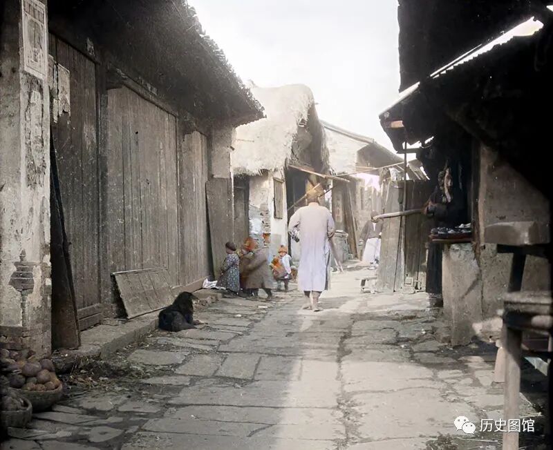 这是30年代南京城内一条古老的小巷,地面铺着石板,两侧的房子已经很有年头了。都是一些商铺,有的在开门营业,有的大门紧闭。几个小孩子站在巷子口玩耍,一家店铺门口,卧着一只小黑狗。