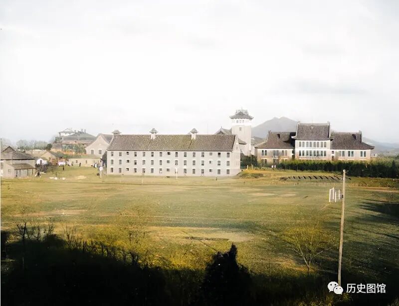 这是30年代南京大学校园的景象。教学楼为典型的欧式风格,远处还有高高的塔楼。近处的场地是学校的足球场,还能看到白色的球门。