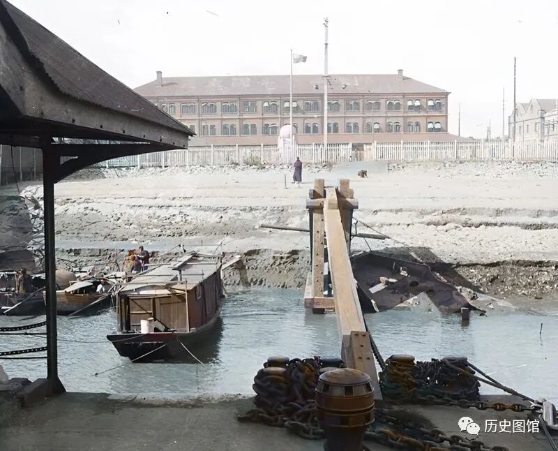 这张照片拍摄于南京的浦口,远处那栋三层斜顶欧式建筑,就是当时的浦口火车站的候车大楼。火车站前面,有一个小码头。几艘小船停靠在岸边。