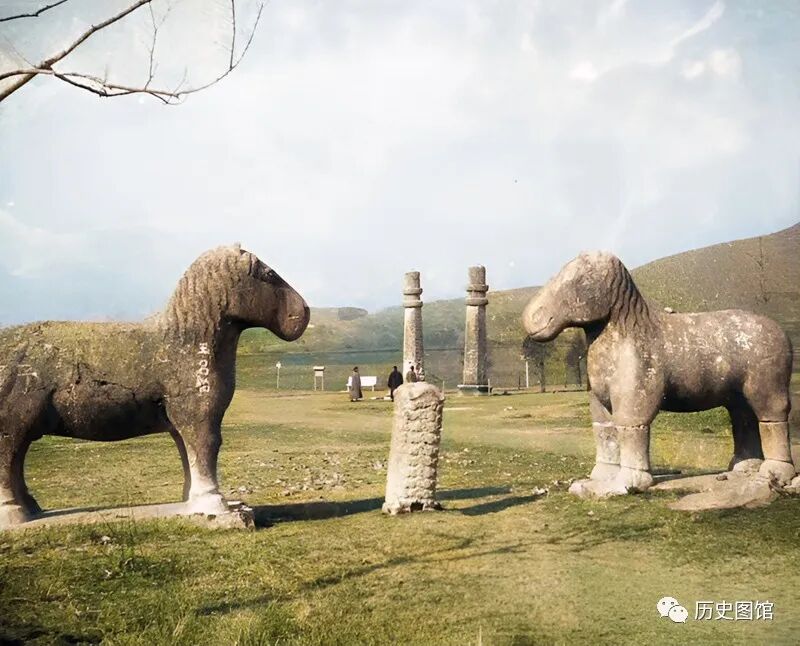 照片中,两匹雄壮的马相对而立,石马的雕刻非常写实,马头上的鬃毛、眼睛和嘴巴,都刻画得惟妙惟肖。