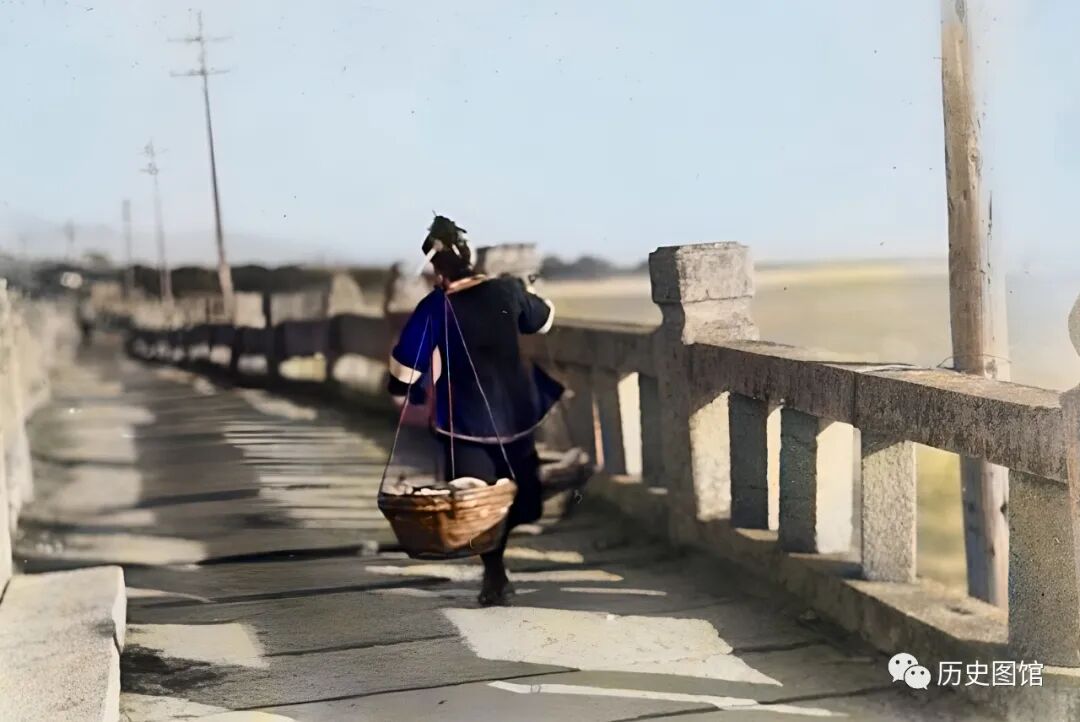 一位妇女穿着民族服装,挑着担子从桥上走过。筐里装的是农产品,她要到对面的集市上去贩卖。
