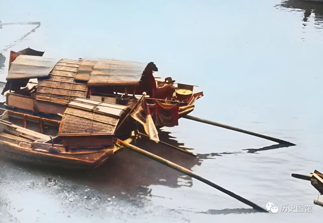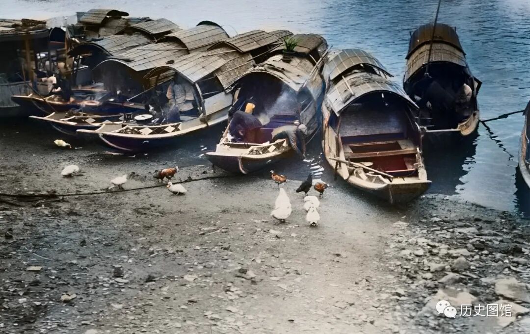 船即是家,家即是船。这是船上人家的生活瞬间,在船上吃住,炊烟袅袅,岸边还养有鸡鸭。充满了生活气息。照片拍摄于1941年。