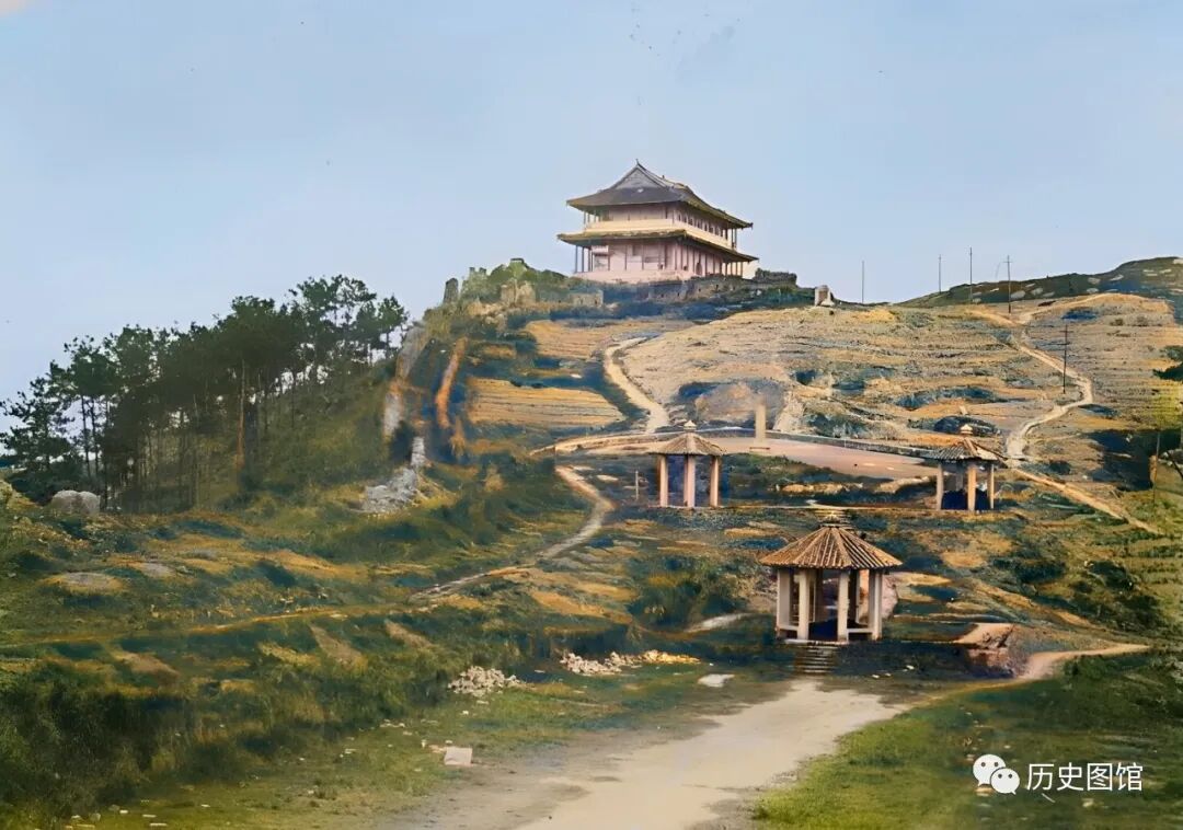这是位于屏山上的镇海楼,镇海楼位于山顶最高处。两条小路蜿蜒曲折,一直延伸到山顶,沿途还建有几座凉亭。这张照片拍摄于1929年。