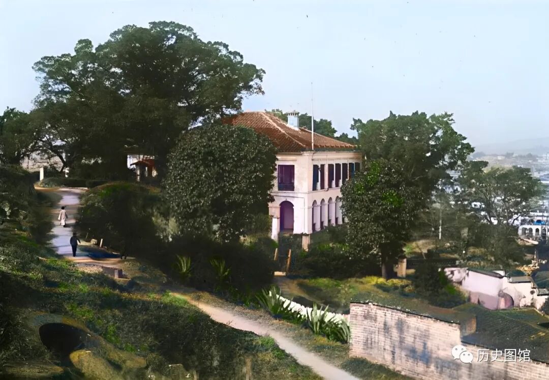 这是位于仓山上的外国领事馆,建在山坡上,典型的欧式建筑。前面还建有一座小型花园,远处是福州民居。照片拍摄于1939年。