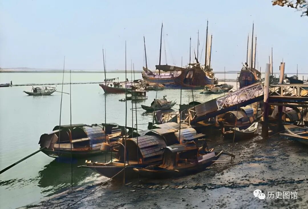 这张照片拍摄于1939年的福州繁忙的码头。远处,由于岸边水浅,一艘大船在深水处卸货,小船把货物载到岸边,再由工人搬运上岸。