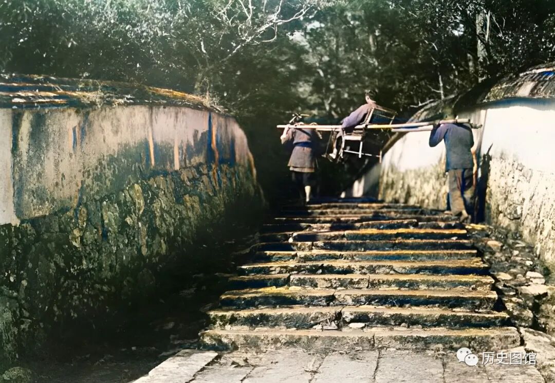 这是福州很有特色的竹椅轿,竹椅扶手位置,绑两根长竹竿,由两名轿夫抬着走。乘客坐在椅子上,可以减少爬山的劳累。这张照片拍摄于1941年。