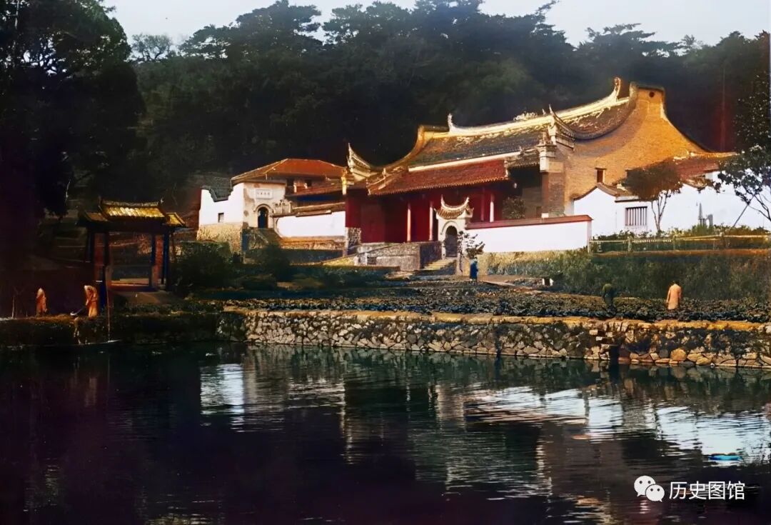 该寺始建于公元908年,历经数次焚毁重建。清康熙皇帝御书“涌泉寺”泥金匾额至今仍高悬于天王殿寺门之上。照片中的涌泉寺金碧辉煌,飞檐凌空,寺庙临水而建,几名僧人正在寺庙前打扫卫生。