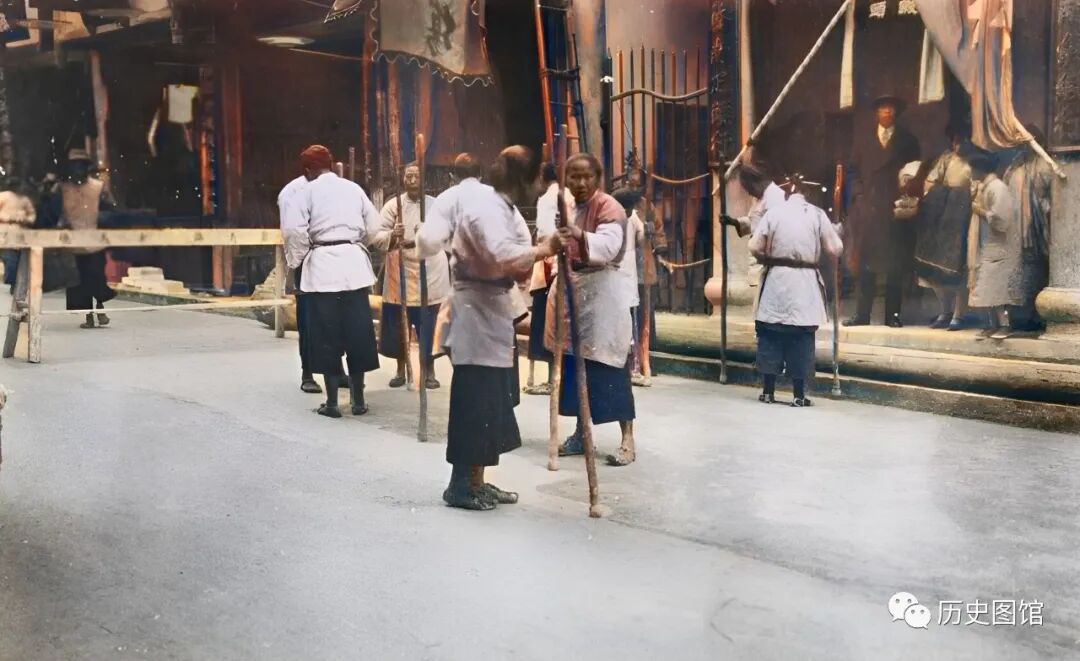 这些妇女,手里都拿着一根棍子。她们站在一家绸缎庄门前,等着帮人挑物。这张照片拍摄于1941年。