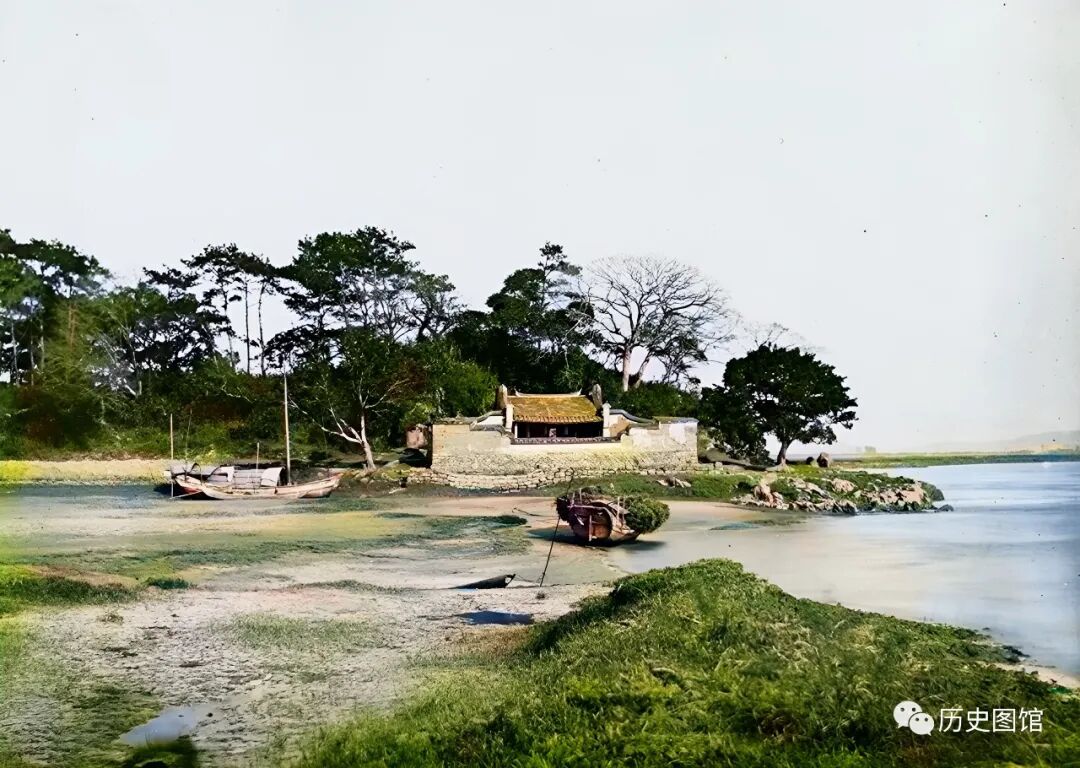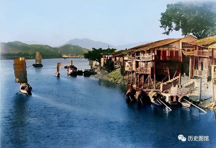 这是闽江中一座小岛,拍摄于1929年。小岛上绿树成荫,高脚楼临水而建。江面上,一艘艘帆船驶过,远处的青山连绵起伏。