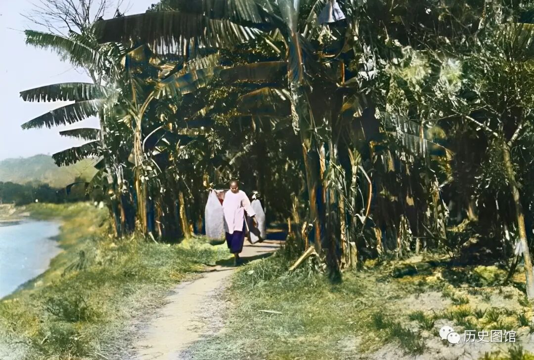 这是一片浓密的芭蕉林,旁边是一条河。一名赶路的妇女,挑着担子从芭蕉林里走出来。这张照片拍摄于1939年。