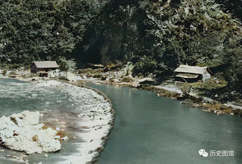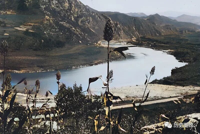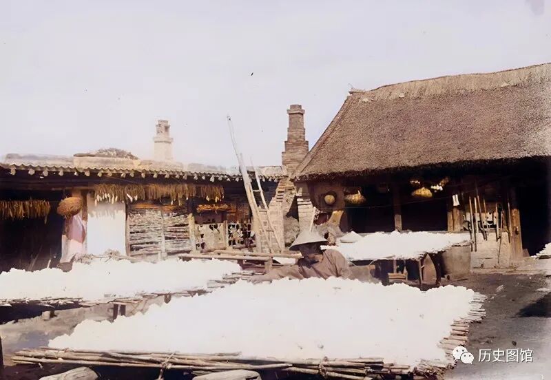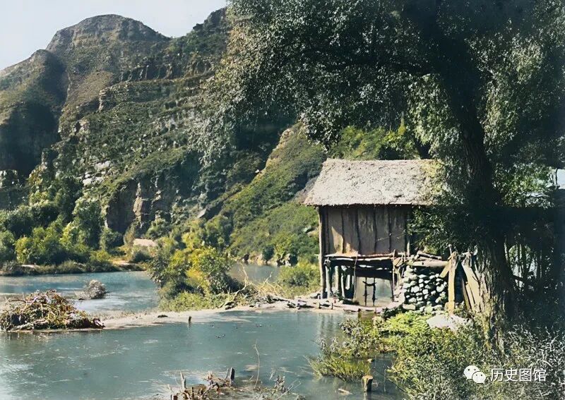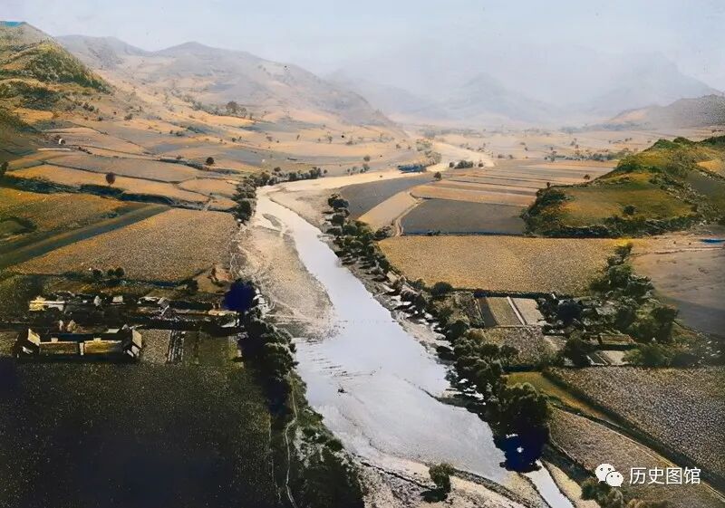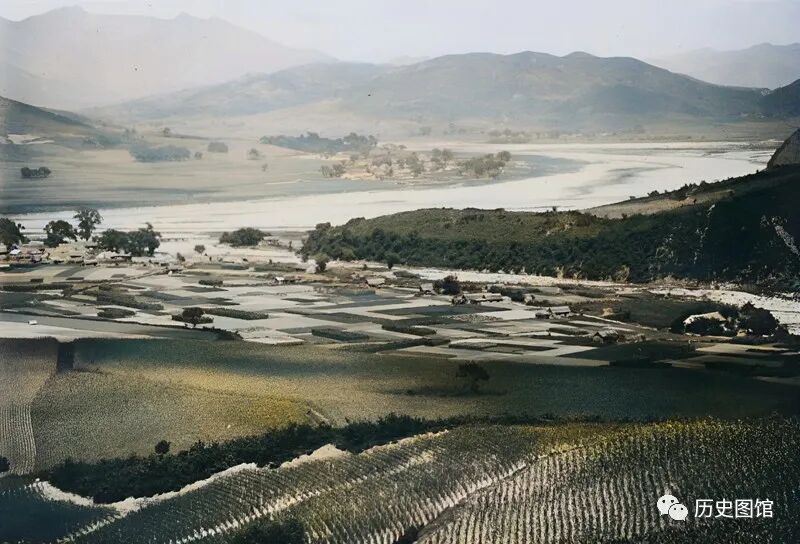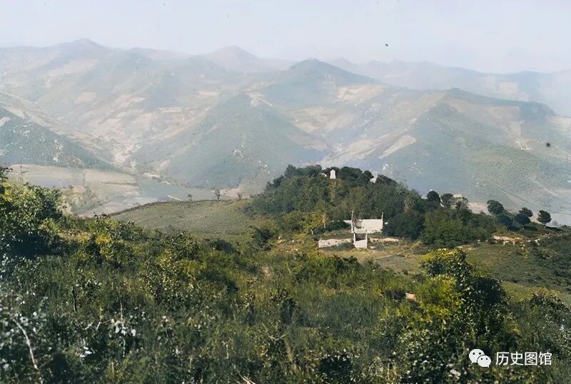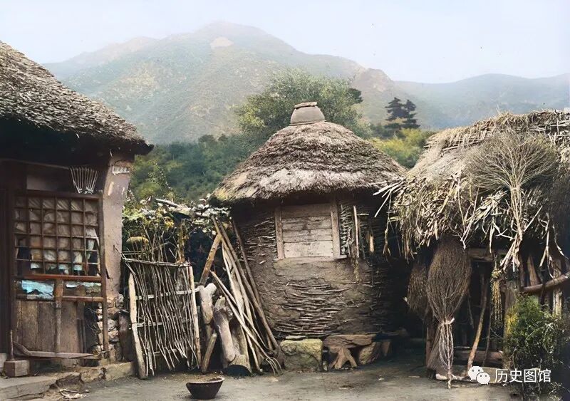 这是太子河流域的一个小村落,古朴的农家小院,特别有年代感。照片中能看到这户人家的厨房、鸡舍、谷仓和柴房等。房顶都是用秸秆覆盖。这样的建筑形式,在当时的北方很常见。远处,还能看到笼罩在薄雾中的远山。