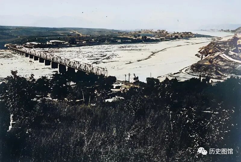 一座铁路大桥横跨在太子河上,桥下河水湍急,河对岸的山势较缓,上面点缀着一些村落。照片右侧,好像是工厂,或者采沙场。