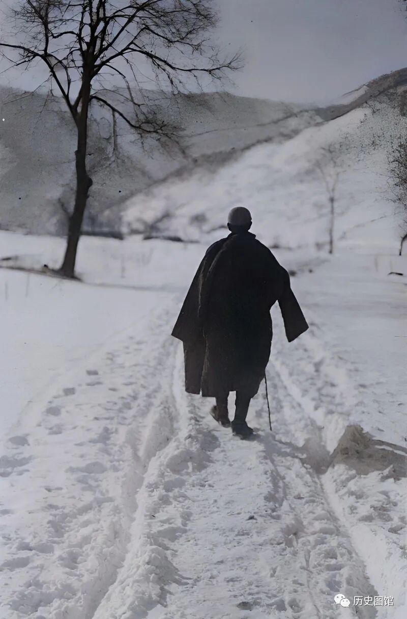 一场大雪覆盖了本溪连山关附近,一片银装素。路上有厚厚的积雪,两道深深的车辙延伸向远方。一名老人拄着拐杖,正沿着车辙向家中走去。