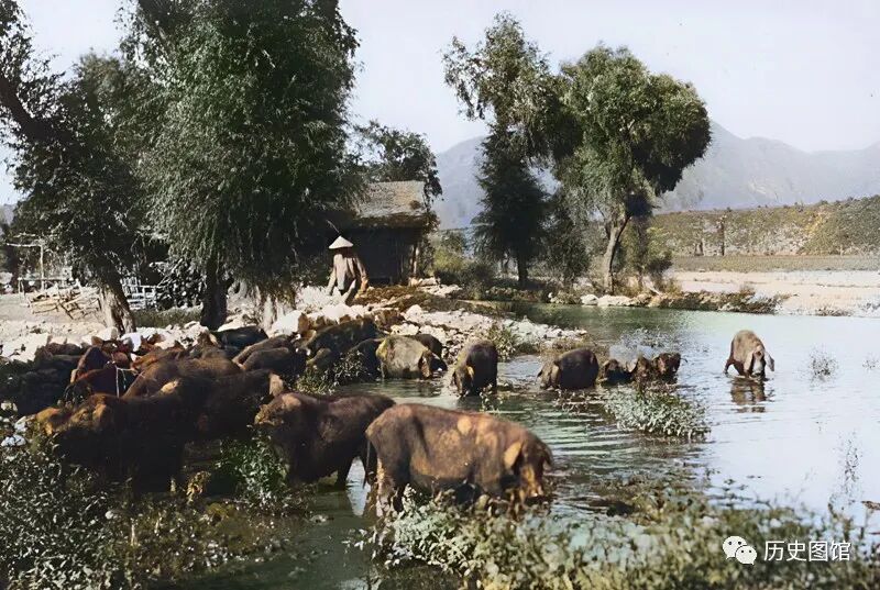 本溪桥头附近有一座房舍,房舍前还有木质的围栏。这是当时的一个规模不大的养殖场。一名戴着斗笠的男子正站在岸边,靠近岸边的浅水区里,二十多头黑猪正在水里找吃的。这画面,充满了田园风。