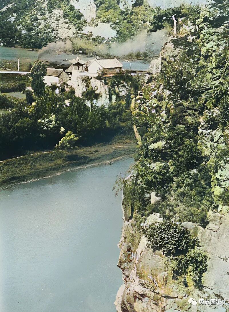 这张照片也拍摄于钓鱼台附近,细河河水在这里变得平缓起来。站在山头上向对岸望去,一列火车正冒着黑烟疾驰而过。铁道旁边的巨石之上,有一些古建筑,看上去像是一座庙宇。小庙的后面,就是绝壁。