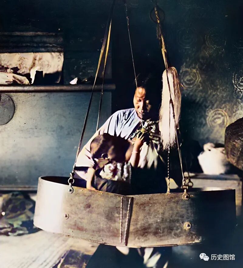 太子河附近一户农家,摇篮里的孩子刚刚睡醒,母亲赶紧过来抱着他。这个摇篮用铁皮焊接而成,用生在吊在房梁上。轻轻晃动之下,孩子很快就能睡着。