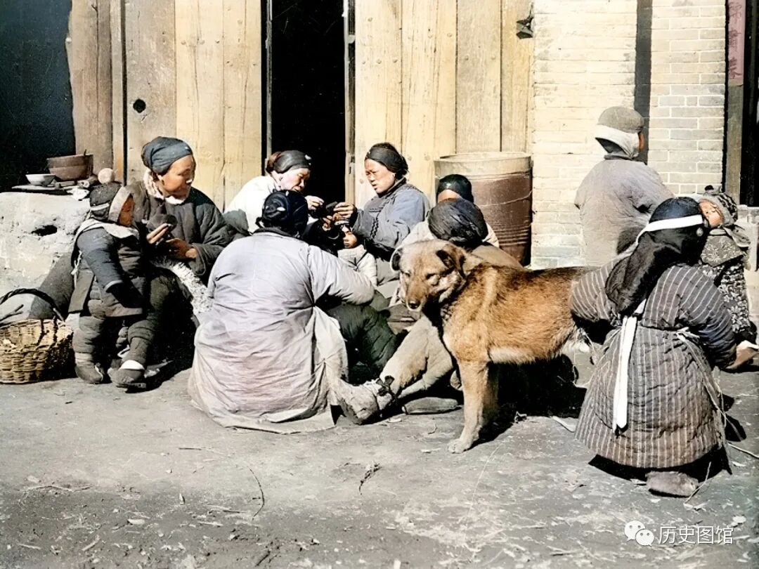 冬天的时候,人们喜欢坐在门外晒太阳。这几名妇女坐在一起打牌,有的正在做布鞋。小孙子乖巧地依偎在身旁。人群中还有一只温顺的大黄狗。