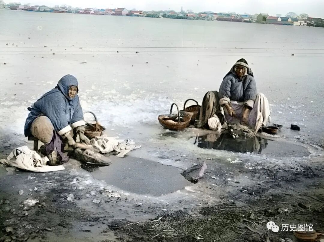 寒冬腊月,龙亭边的湖面上结了厚厚的一层冰。两名妇女带着篮子和板凳,来到湖边。她们砸开冰面,取水浆洗洗衣。